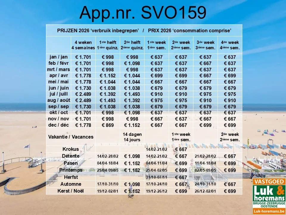 APPARTEMENT DE VACANCES (LOC. SAISONNIERE) - à partir de 400 Euro par semaine - situé Promenade Albert I (digue) - près du monument des Marins. Appartement 2ième étage se composant de: Hall, living spacieux avec belle vue sur mer, cuisine avec lave-vaisselle, salle de bains, 2 chambres à coucher - Maximum 4 personnes - prix des loyers (excl. garantie et nettoyage final): voir 4ième photo.