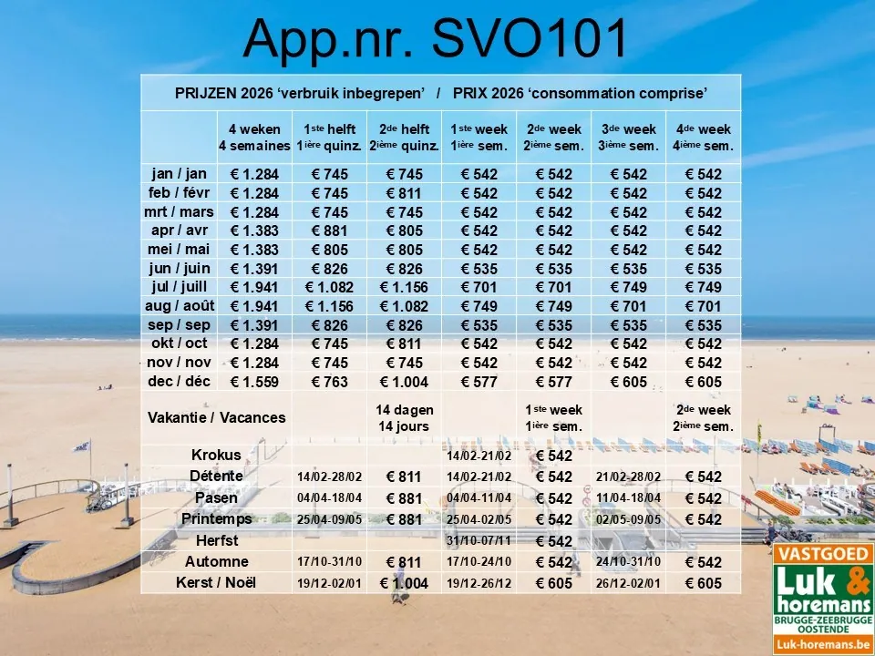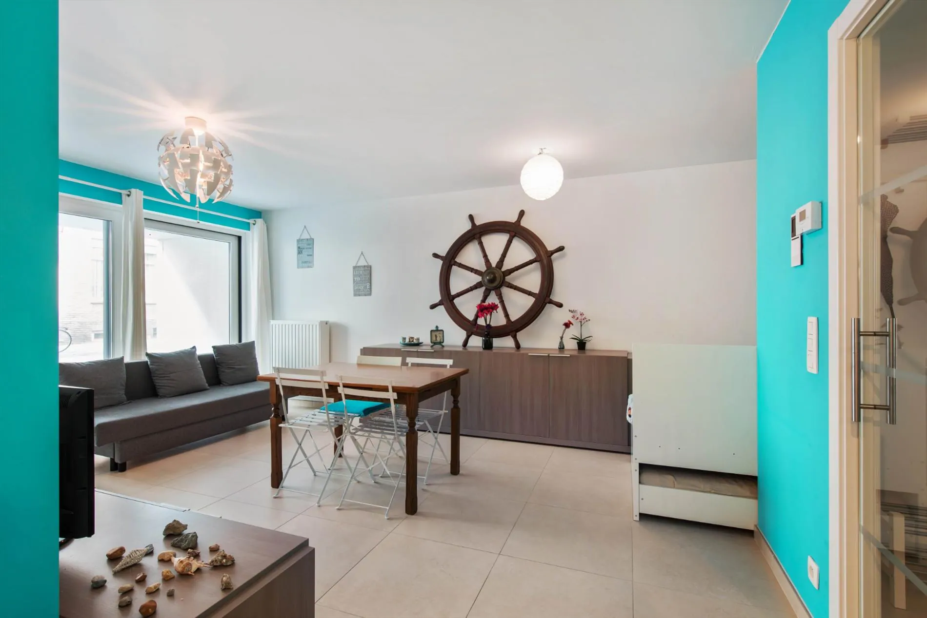 App. agréable nouvelle construction situé centre d’Ostende (près de la plage et du centre commercial). App. au rez de chaussée se composant de: hall, living avec terrasse (soleil dans l'après-midi), cuisine équipée et ouverte, salle de bains avec douche, 1 chambre à coucher. Télévision par internet dans le living et la chambre à coucher - chambre à coucher avec lit double - lit divan (2 personnes) - 2 lits pour enfants dans le living - maximum 4 adultes et 2 enfants - prix des loyers (excl. garantie et nettoyage final): voir 4ième photo.