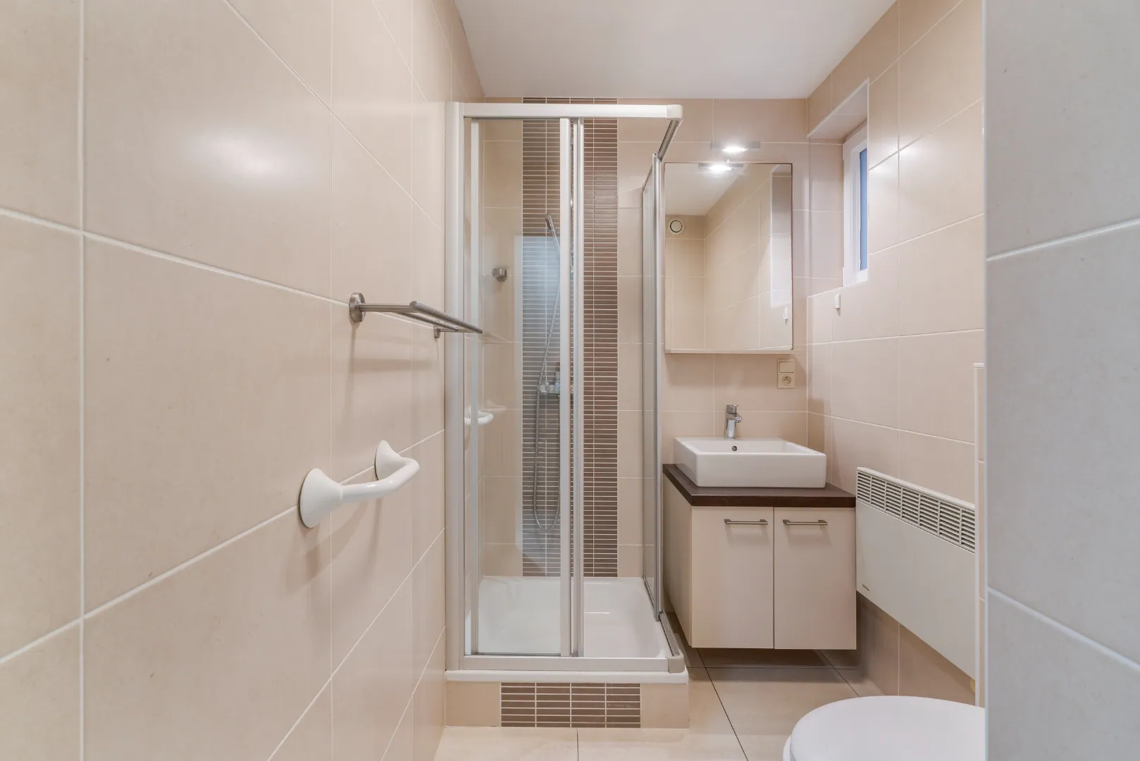 | Salle de bains | Douche, Lavabo simple, Toilette dans la salle de bains, Carrelage |