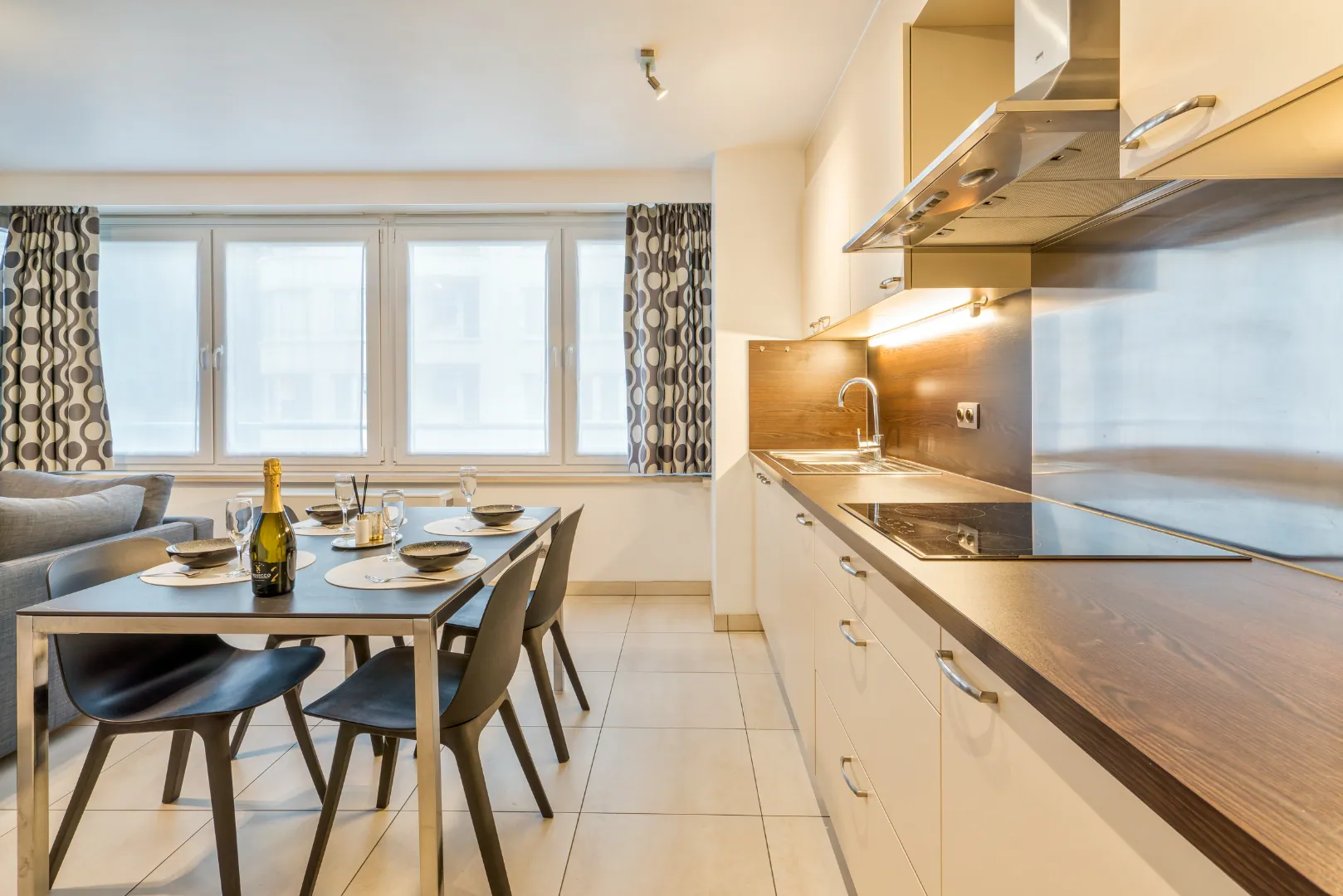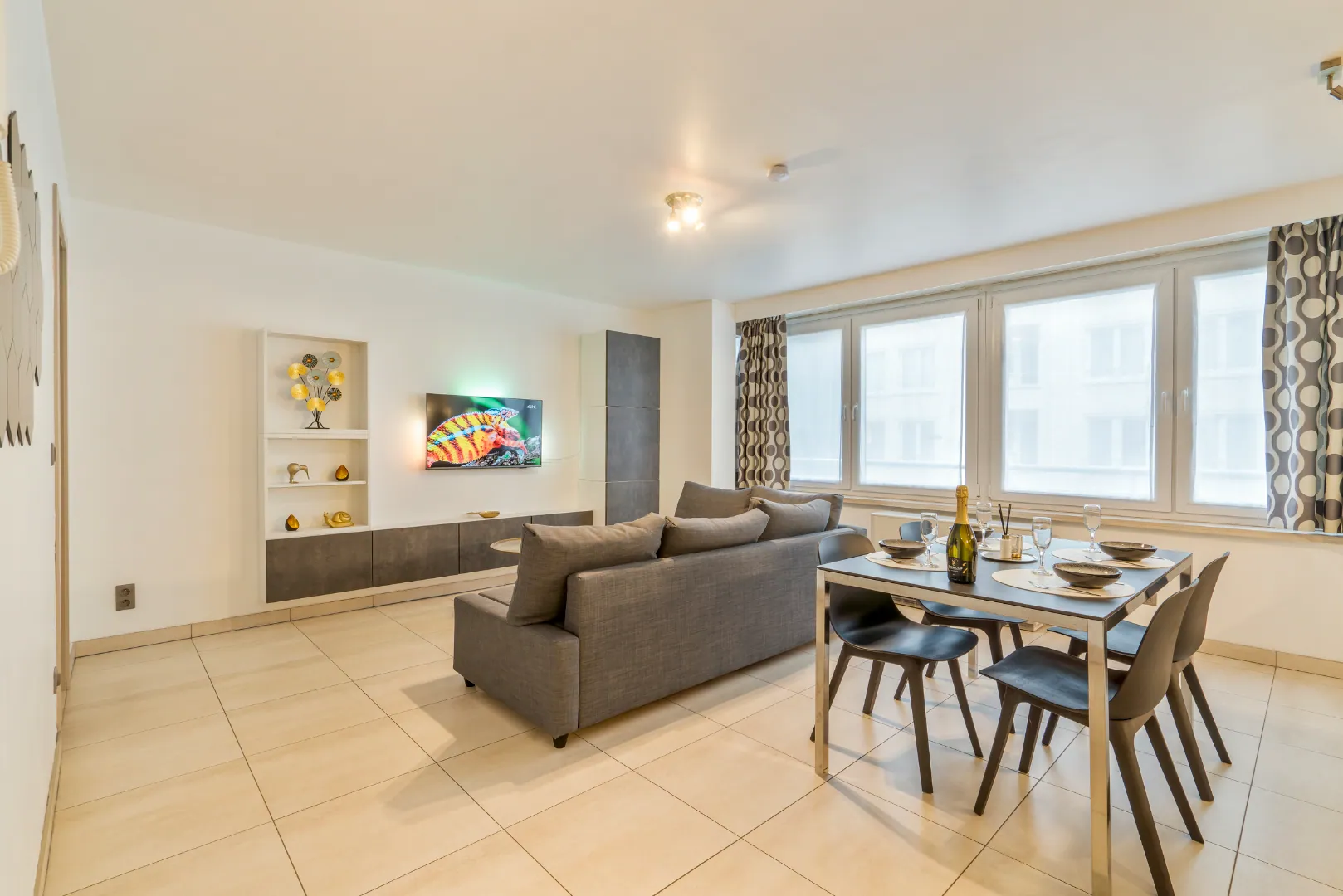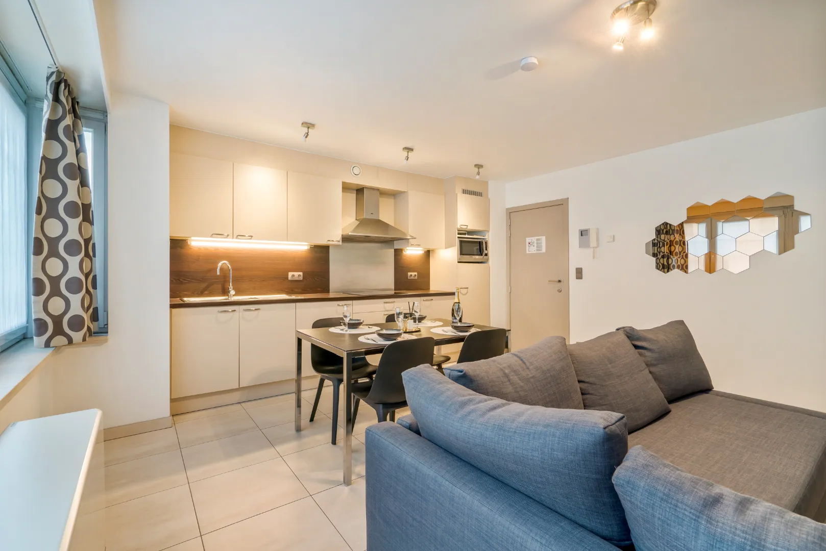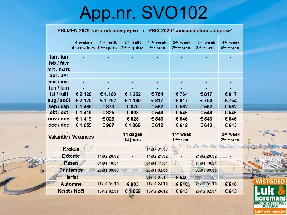 Internet - Internet TV – Netflix – combi four/micro-onde - plaque vitrocéramique - réfrigérateur avec compartiment congélateur - Senseo - 1 x lit double (2 matelas de 80 cm) avec couette double (220 - 200) et oreillers (40 x 60) présents - rideaux occultants - canapé-lit dans le séjour (matelas 140 cm, couette 180 – 200) – 4 personnes max. - local à vélos dans l'immeuble - ascenseur - accessible en fauteuil roulant - non-fumeur - animaux non admis - prix de location (hors caution et nettoyage final): voir 4ième photo.