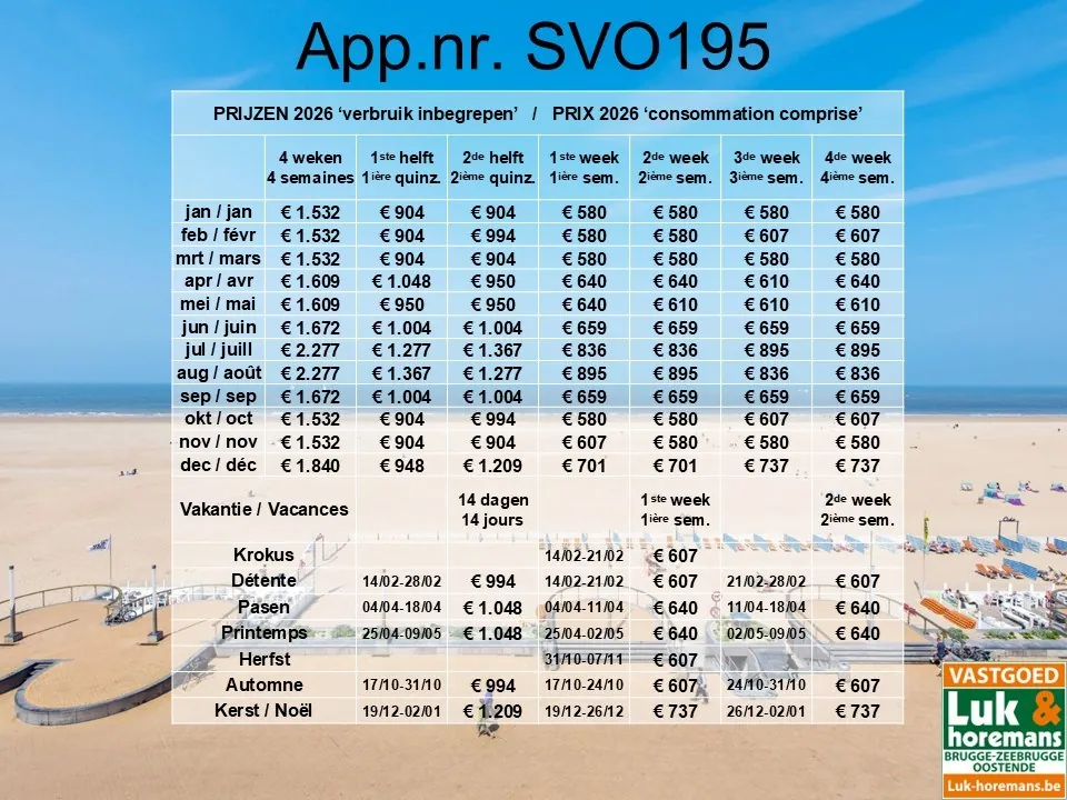 Appartement de vacances spacieux (85 m²) dans la résidence "North", située dans la Van Iseghemlaan à proximité du casino et du front de mer, dans le centre d'Ostende. Cet appartement est la base idéale pour vos vacances à Ostende, le front de mer est à 160m de l'appartement, le supermarché à 160m, tous les restaurants et magasins sont accessibles à pied.
