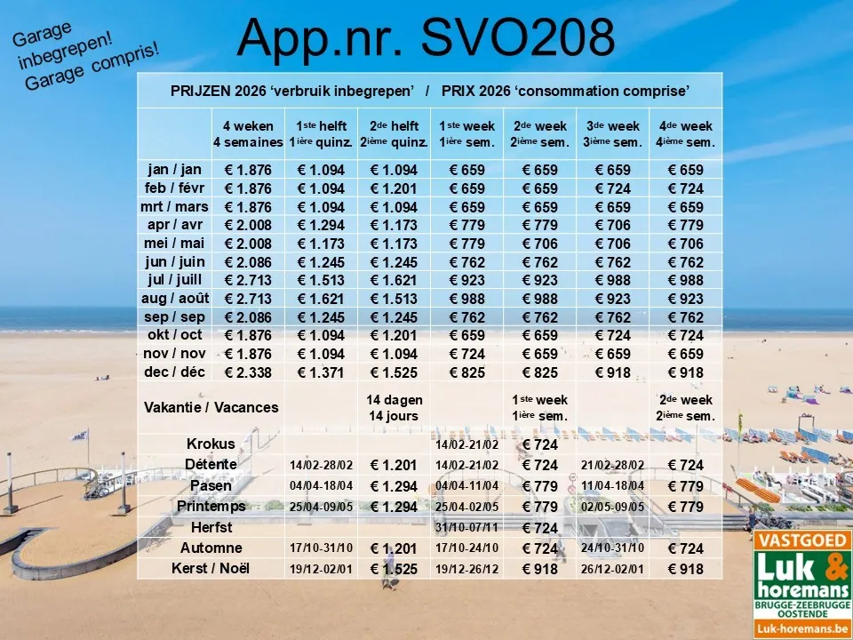 Appartement de vacances dans la résidence « Europacentrum », située dans le centre ville animé d'Ostende. Cet appartement au 26ème étage comprend un hall d'entrée spacieux, un séjour avec terrasse et vue magnifique sur la mer, une cuisine, une salle de bains, une toilette et 2 chambres à coucher avec vue sur le port et la ville. Une place de parking dans l'immeuble est incluse.