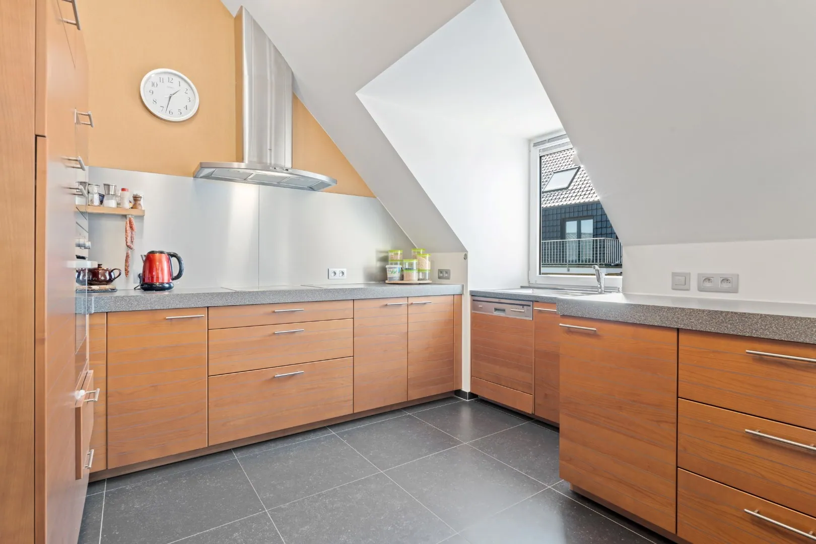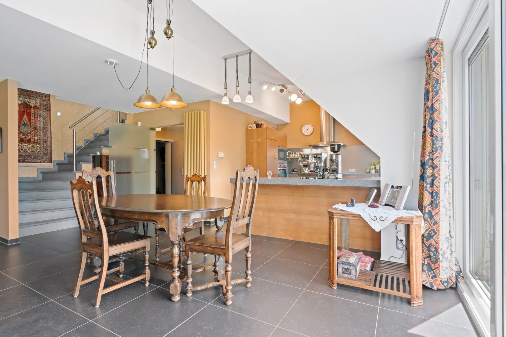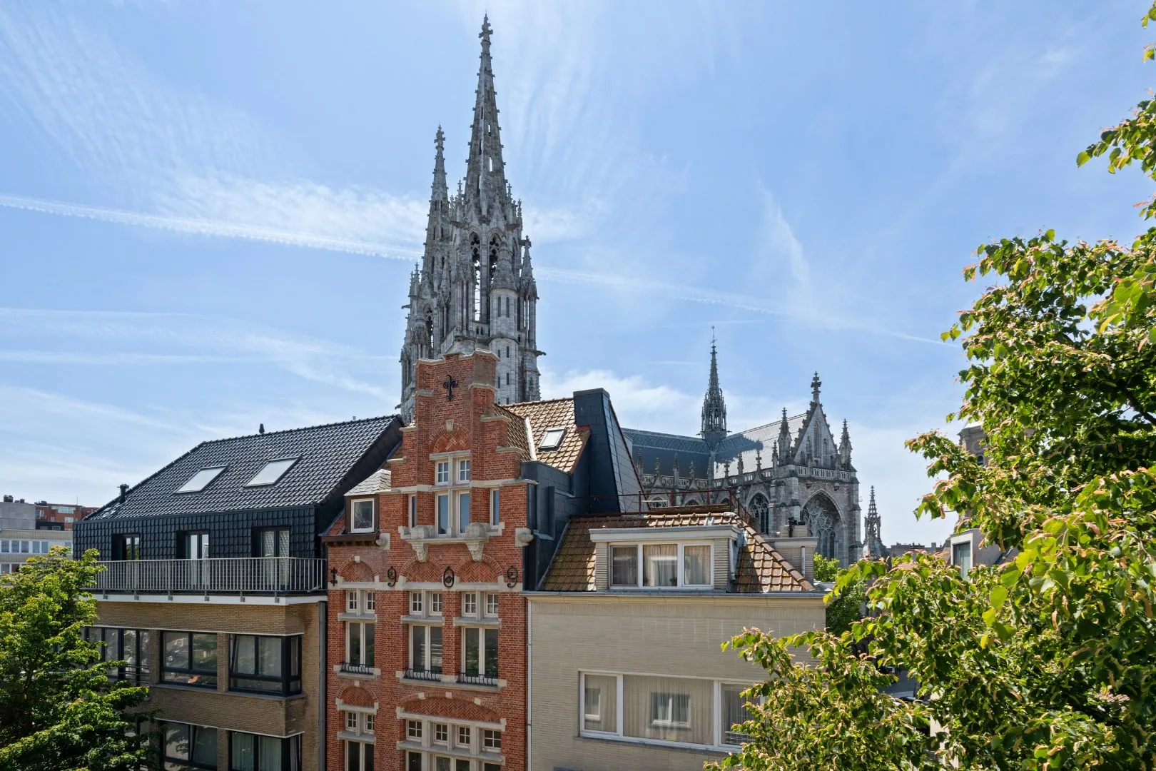 Le hall d'entrée est équipé d'armoires encastrées et dispose d'une toilette et d'un débarras avec raccordement pour machine à laver. Le salon est spacieux et lumineux et donne sur la terrasse ensoleillée, d'où vous pourrez admirer la vue sur Sint-Petrus et Paulusplein. La cheminée à gaz rend la pièce encore plus confortable en hiver. La cuisine ouverte est équipée de tout le confort moderne : plaque vitrocéramique, réfrigérateur, congélateur, four, micro-ondes et lave-vaisselle. Au même étage se trouve la chambre principale, équipée d'armoires encastrées et d'une salle de bains attenante avec baignoire, toilettes et double lavabo. Les fenêtres sont équipées de volets électriques.