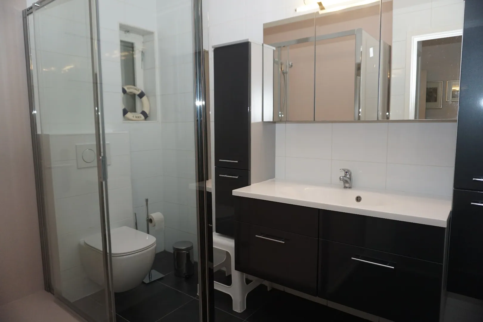 | Badkamer | Douche, Enkele lavabo, Haardroger, Toilet in de badkamer, Vloertegels |