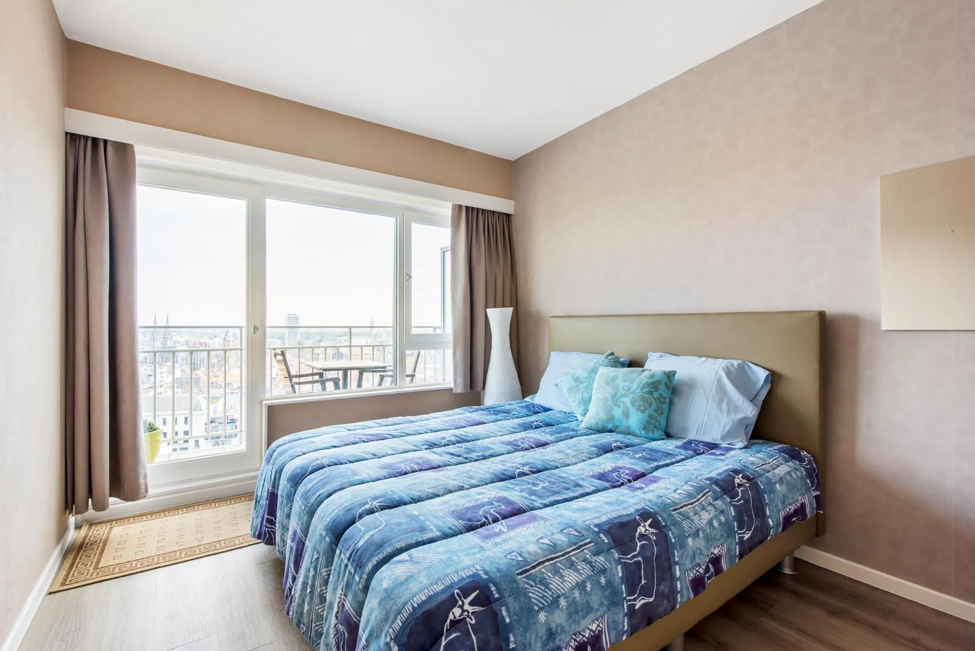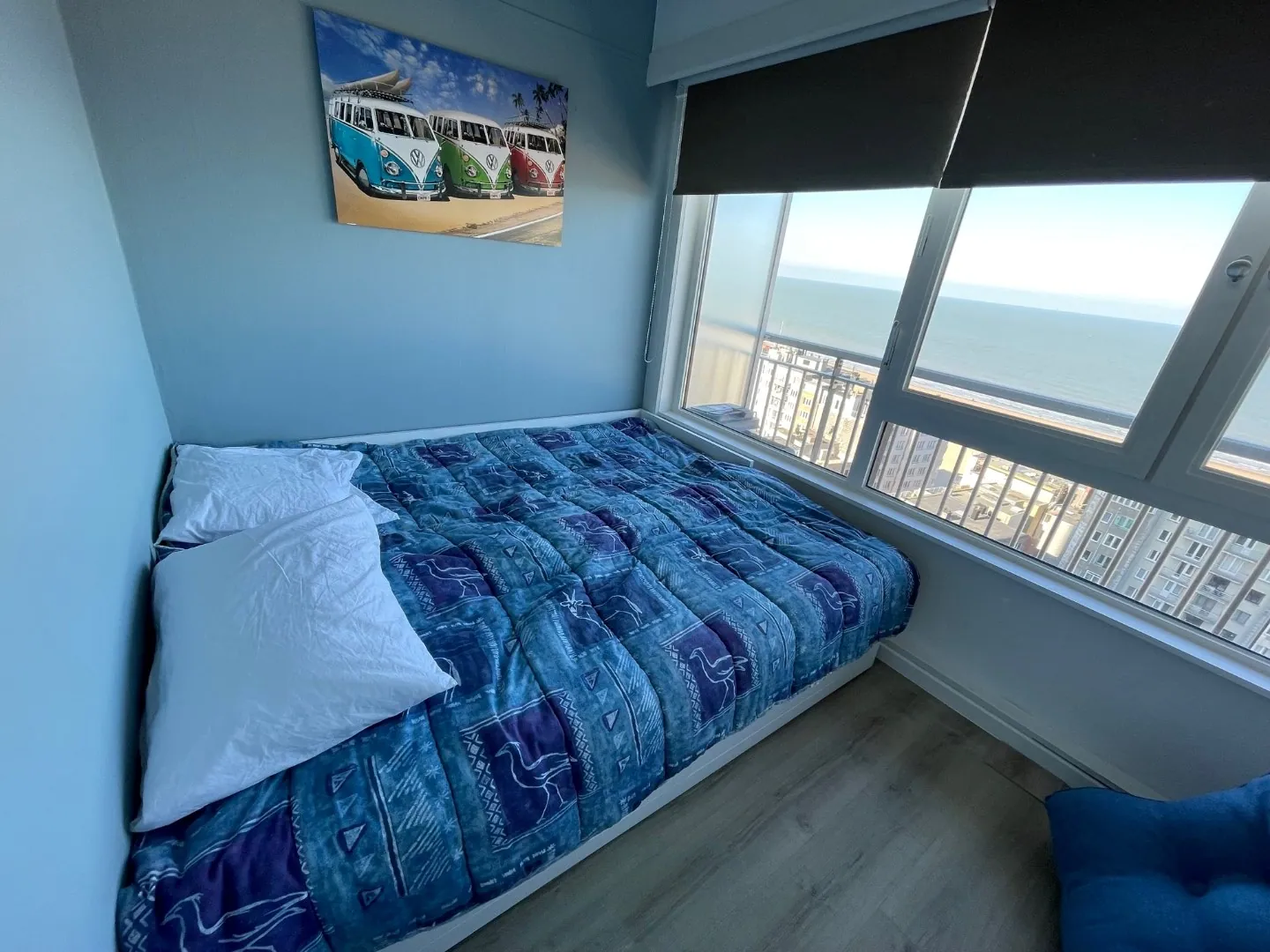 Centraal gelegen luxueus en modern vakantie appartement gelegen op de 19de verdieping in de Van Iseghemlaan, dichtbij Albert I Promenade, met prachtig zicht op zee en hinterland, terras voor en achteraan. Bestaande uit: Hal, ruime living, keuken, badkamer met douche en toilet, 3 slaapkamers (2 x tweepersoonsbed 160 x 200 - 1 x uitschuifbaar bed 2 personen 160 x 200 ), apart toilet.