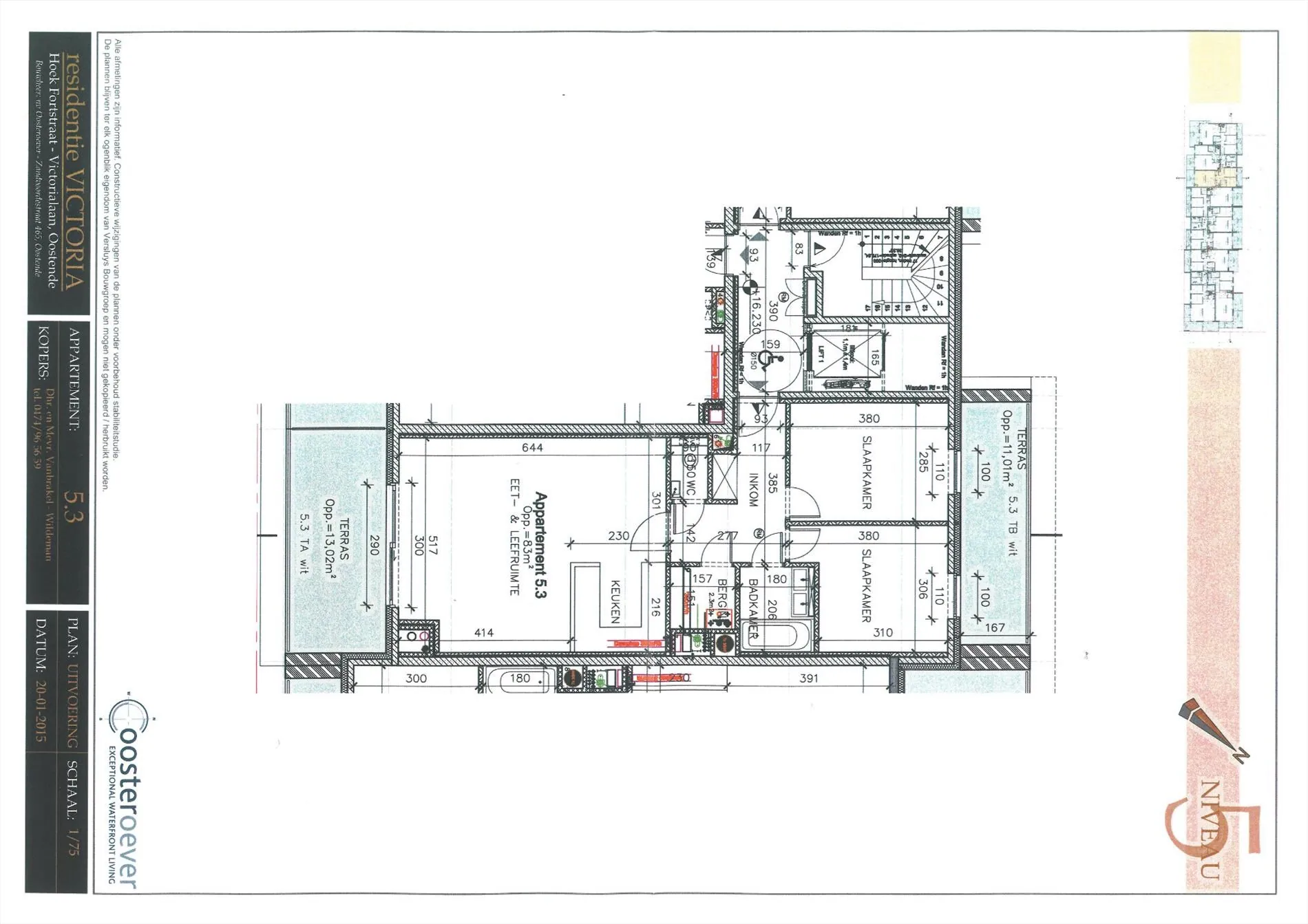 App. op de 5de verdieping met zowel voor- als achteraan een mooi open zicht. Bestaande uit: hal, living met open keuken en zonnig terras (13,02 m²), badkamer met ligbad, berging, 2 slaapkamers met terras (11,01 m²). Totale oppervlakte: 83 m² + 24,03 m² terrassen.