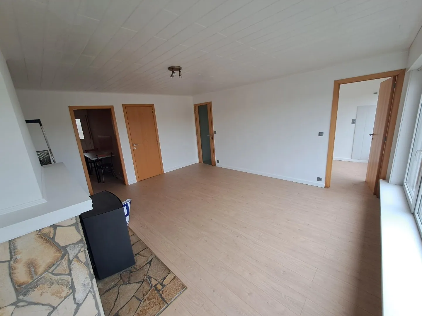 Bestaande uit een living met gaskachel, keuken, 2 slaapkamer, vernieuwde badkamer met douche lavabo en toilet, terras achteraan, ruime garagebox met elektrische poort achteraan het gebouw.