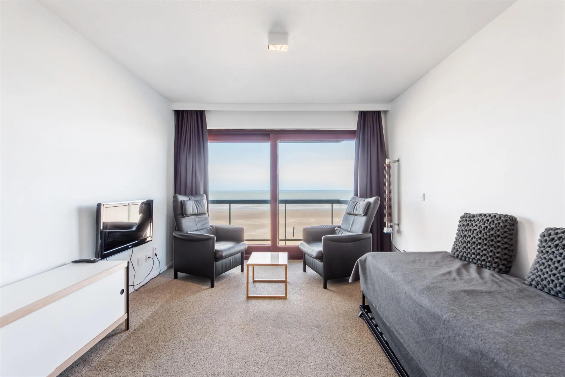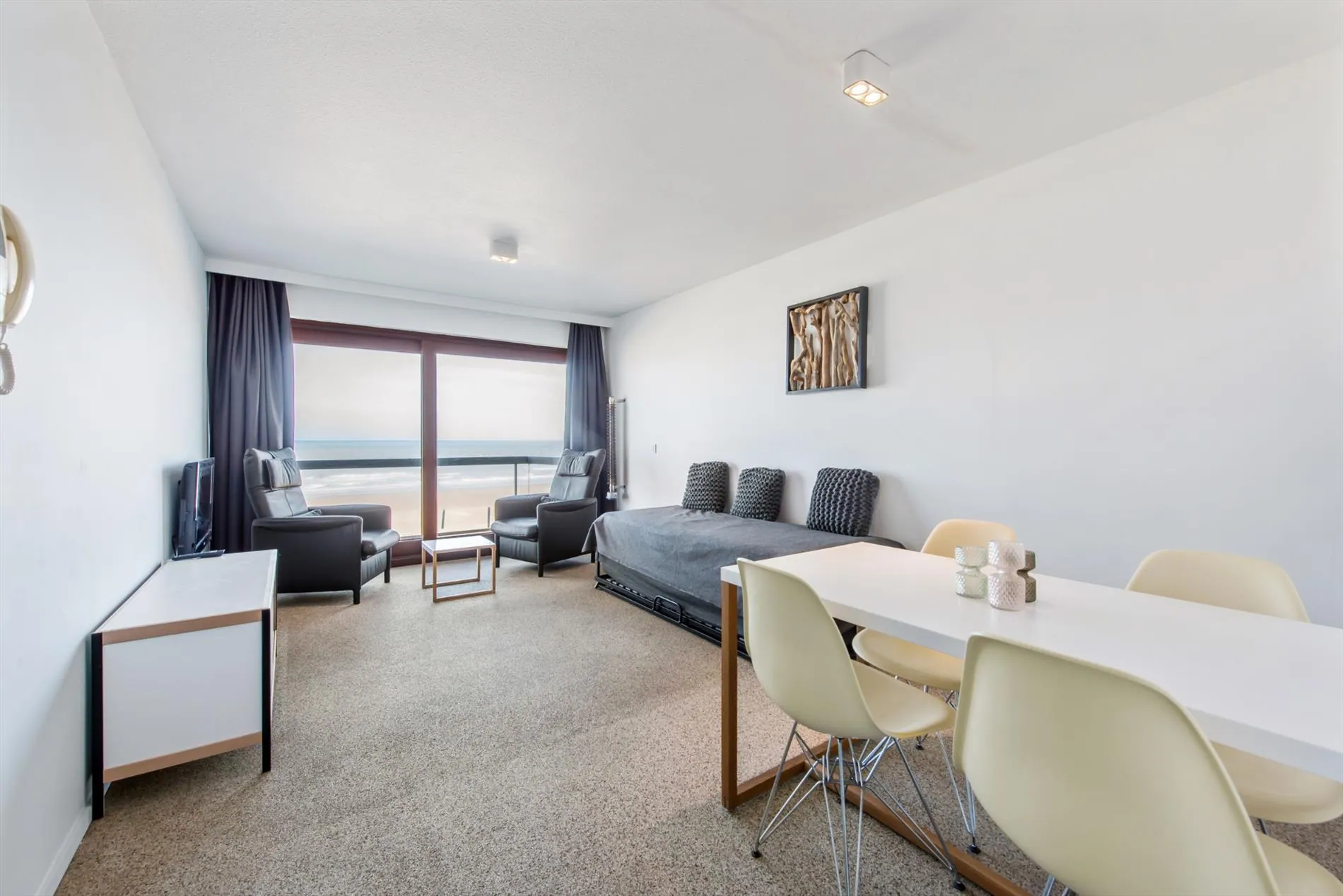 VAKANTIE APPARTEMENT (VAKANTIEVERHUUR) - Residentie Château Belvédère - Prachtig gerenoveerde studio op de 5de verdieping met frontaal zeezicht, gelegen op de hoek van de Hertstraat en de Albert I Promenade (zeedijk) - dicht bij Casino – Bestaande uit: Hall, living met terras en met prachtig zicht op zee, open keuken, slaaphoek met stapelbed dat kan omgevormd worden tot tafel met zitbank, zetelbed, badkamer met ligbad en toilet.