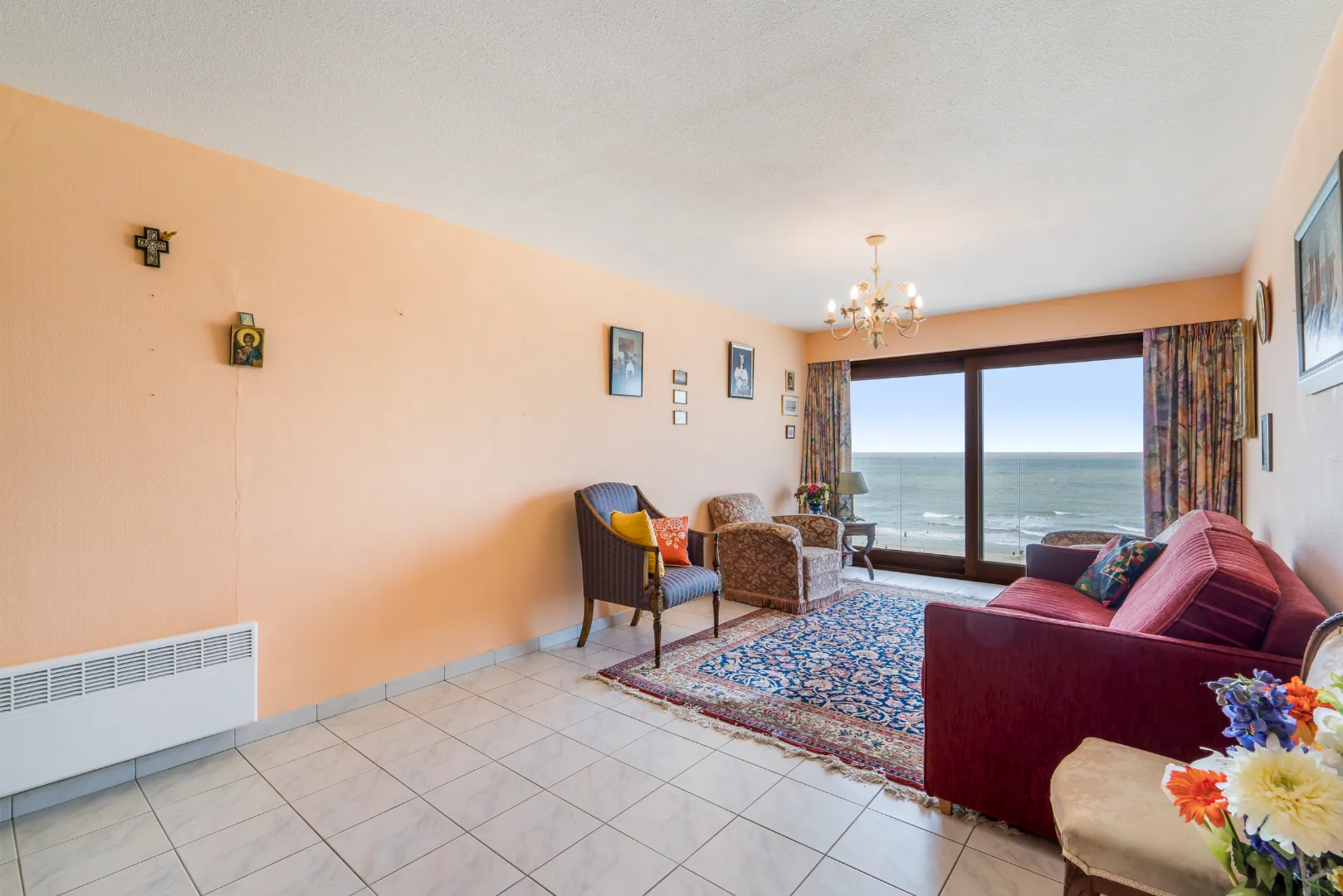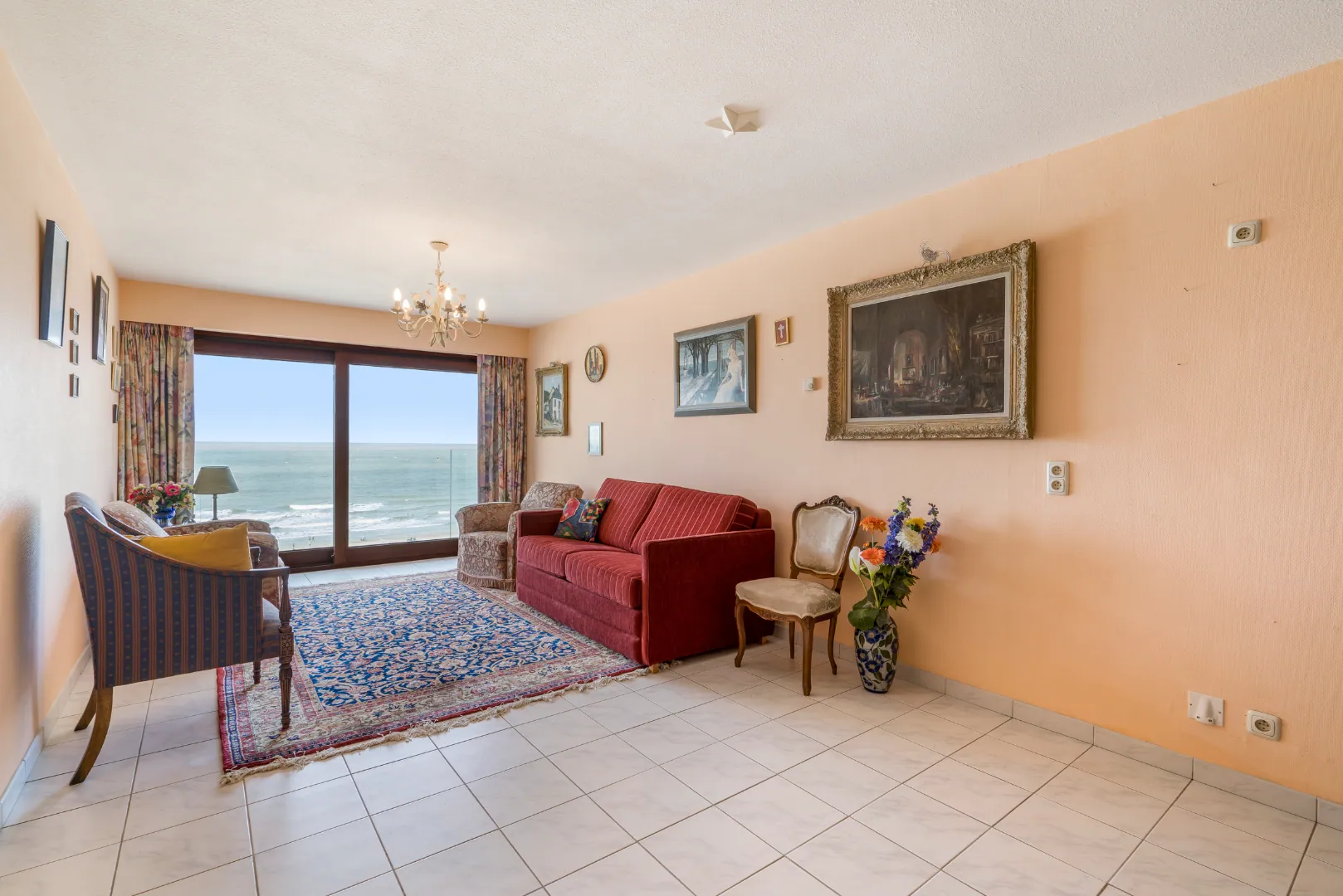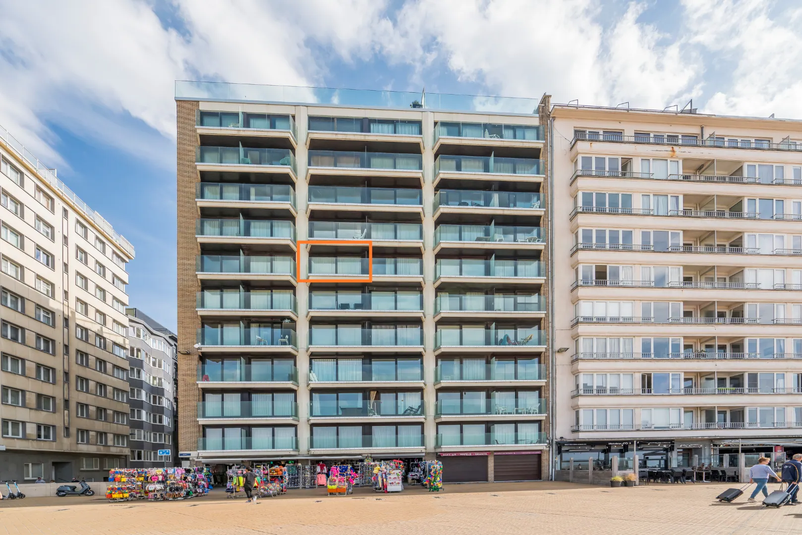 Het appartement bestaat uit een living met terras en frontaal zeezicht, badkamer met douche en wastafel, brede hall met ingemaakte kasten, 2 slaapkamers, en een kelder. Er is mogelijkheid om een nieuwe keuken te plaatsen in het appartement, en dit zonder ingrijpende werken. Dit appartement op de 6de verdieping heeft een bewoonbaar oppervlak van 61 m². Het gebouw is zeer goed onderhouden. Mogelijkheid om een staanplaats aan te kopen 650 meter van het appartement in parking Leopold. De vraagprijs voor de autostaanplaats bedraagt 30.000 euro.