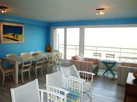ruim appartement met frontaal zeezicht, centraal gelegen op de zeedijk. Beschikt over zeer ruime terrassen zowel aan de voorkant als aan de achterzijde van het gebouw. Indeling: woonkamer met zicht op de zee van Zeebrugge, open ingerichte keuken met de nodige toestellen, badkamer met bad en dubbele lavabo, apart toilet, twee slaapkamers met ruime terras. Ruime berging kan eventueel gebruikt worden als 3de kamer of bureau kamer, aparte berging voor was en droogtrommel,