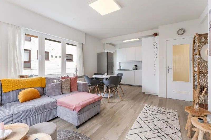 Het appartement werd keurig gerenoveerd tot een hedendaagse, energiezuinige flat. Binnenkomen doet u via een inkomhal. De gezellige leefruimte op parketvloer geniet van veel inval van daglicht. De keuken grenst aan de woonkamer en werd voorzien van alle hedendaags comfort. Verder beschikt het appartement nog over een nachthal, dewelke de verbinding vormt tussen 2 volwaardige slaapkamers met ingemaakte kasten, vernieuwde badkamer met bad, wastafel met meubel en spiegelkast, En een apart toilet.