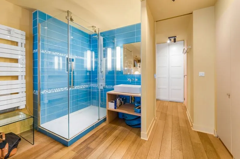 De studio beschikt over een stijlvolle open badkamer, uitgerust met een douche en eigentijdse afwerking, perfect geïntegreerd in het geheel.