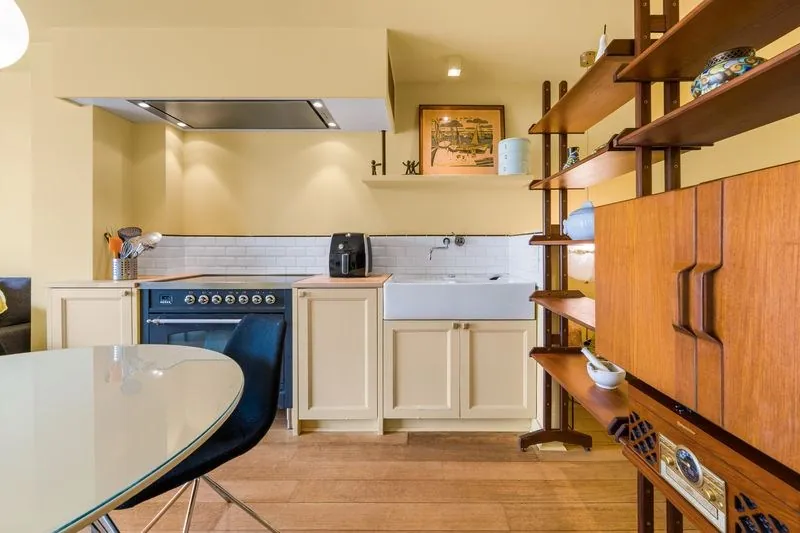 Bij het betreden van het appartement kom je terecht in een gezellige en lichtrijke leefruimte, ingericht met een landelijke open keuken. De open indeling zorgt voor een aangenaam ruimtegevoel en een vlotte verbinding tussen koken en wonen.