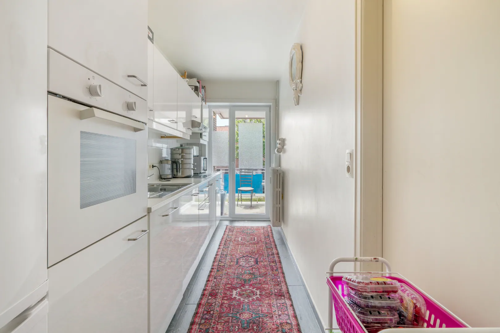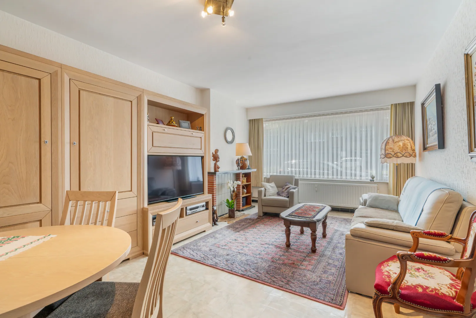 Het appartement op het gelijkvloers bestaat uit inkomhall met inbouwkast, woonkamer (21,39 m²), gesloten keuken (10,33 m²), nachthal, apart toilet, badkamer, 2 ruime slaapkamers (14,50 m² en 16,94 m²) met toegang naar de koer achteraan (9,86 m²) met berging.